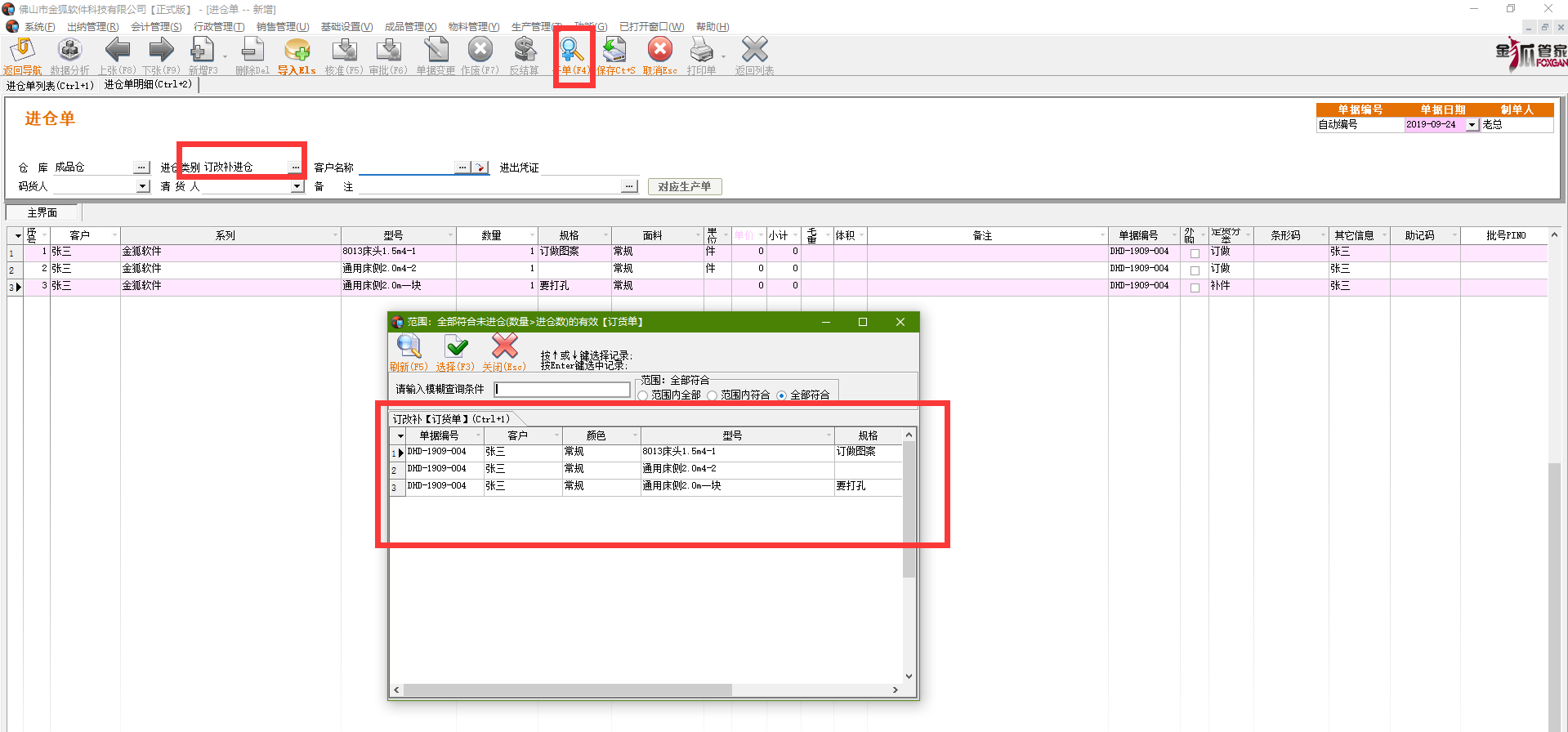 进仓单--新增--进仓类别(订改补进仓)--开单--选订做补件订单--保存--核准